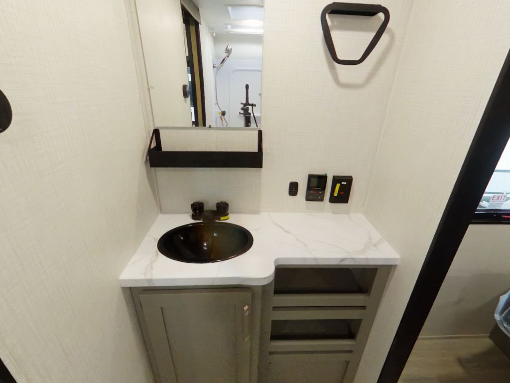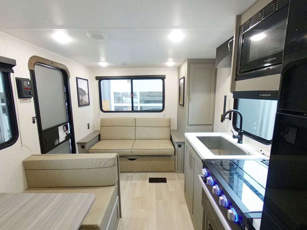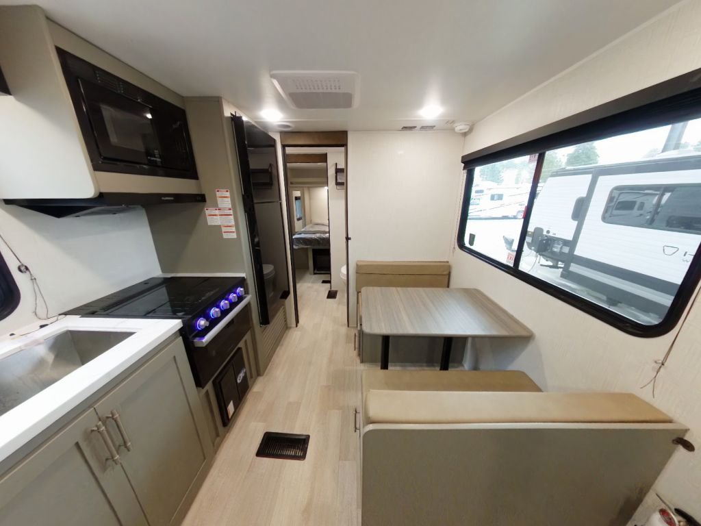 - Modern Comfort: 42K BTU tankless water heater (endless hot showers!), 15K BTU A/C, and a 0.9 Cu. Ft. convection microwave with a built-in air fryer.